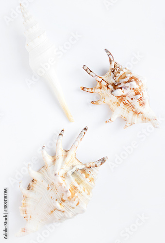 © Юлия Ромашко, Obraz premium Sea shells on a white background. Summer and vacation concept. Top view. Vertical photo.