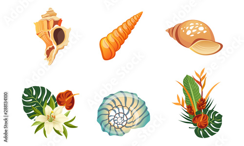 © topvectors, Naklejka premium Sea Shells, Palm Leaves and Flowers Set, Beautiful Tropical Landscape Design Elements Vector Illustration