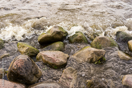 Fototapeta premium Sea stones and waves on the beach. Summer background.