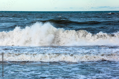 Fototapeta premium sea surface to horizon with big waves with foam and splashes