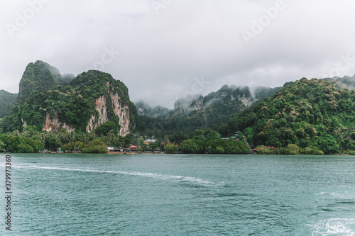 © Alex, Fototapeta premium Sea surrounded by rocky hills covered in greenery and fog at daytime