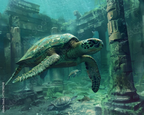 Fototapeta premium Sea turtle adventure exploring ancient underwater ruins