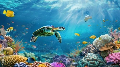 © @adha, Fototapeta premium Sea Turtle and Coral Reef Underwater Scene