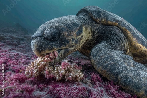 Fototapeta premium Sea turtle feeding on coral. Underwater close-up