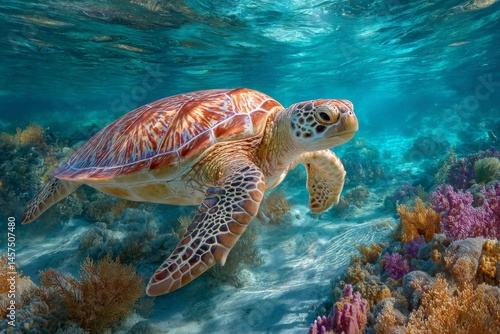 Fototapeta premium Sea Turtle Glides Over Coral Reef in Clear Ocean Water, Peaceful Marine...