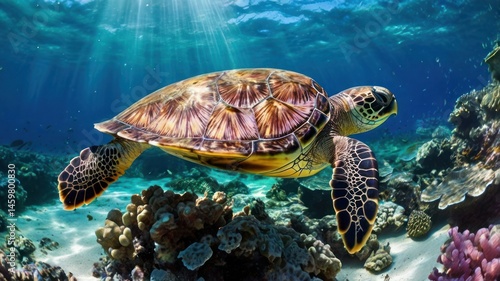 © Rahmat, Obraz premium Sea turtle glides through coral reef