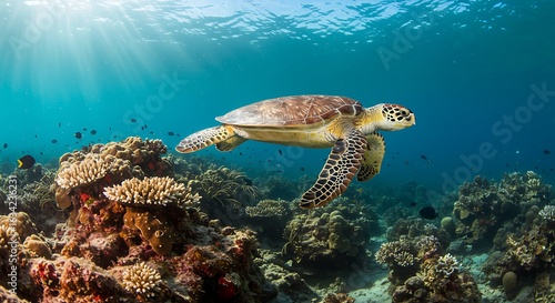 © DianIrma, Fototapeta premium Sea Turtle Gliding Over Coral Reef, Sunlit Ocean