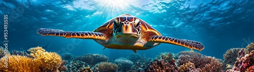 Fototapeta premium Sea Turtle Gliding Over Vibrant Coral Reef