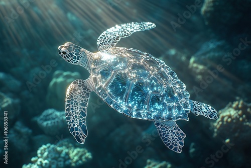 Fototapeta premium Sea turtle gliding over vibrant coral reef underwater.