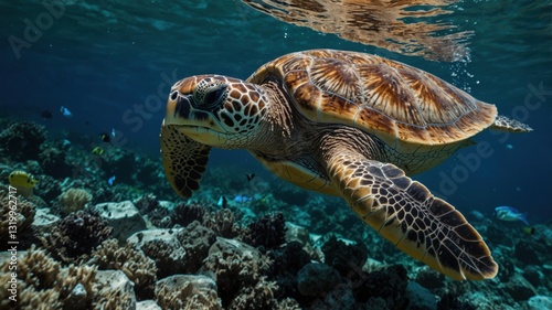 Obraz premium Sea Turtle gliding through clear ocean waters, reef below, sun shining...