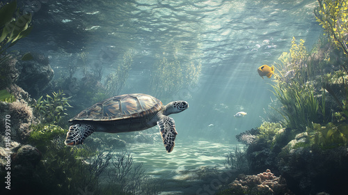 Obraz premium sea turtle gliding through serene underwater environment, surrounded by vibrant marine life