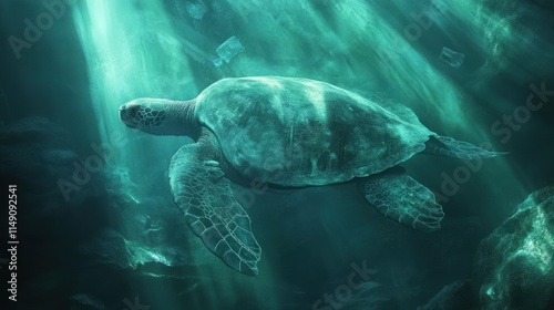 Fototapeta premium Sea Turtle Gliding Through Sunlit Ocean Depths