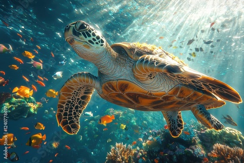 © boler, Obraz premium Sea Turtle Gracefully Swimming Amidst Vibrant Coral Reef