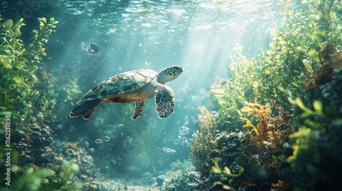 Obraz premium Sea Turtle Gracefully Swimming in Vibrant Coral Reef