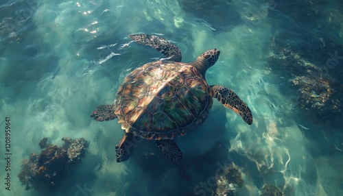 © Inkreatif, Fototapeta premium Sea Turtle Gracefully Swims in Ocean Depths