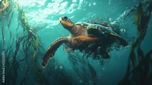 © Futureaz, Obraz premium Sea Turtle Navigating Ocean Entangled with Plastic