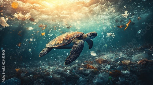 Fototapeta premium Sea turtle navigating polluted ocean waters