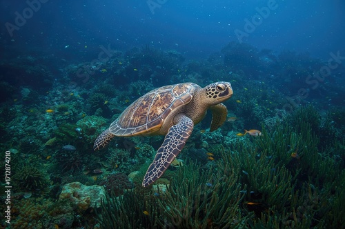 © AImmersive Imagery, Naklejka premium Sea turtle near coral reef