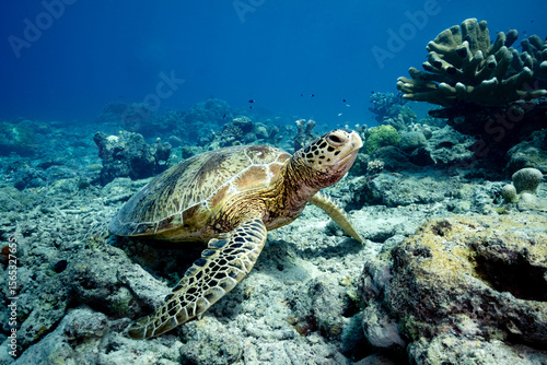 Fototapeta premium Sea Turtle resting on coral reef at Sipadan Island, Malaysia