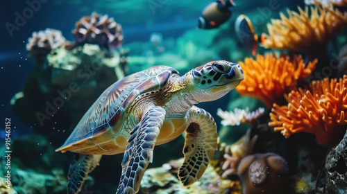 Naklejka premium Sea Turtle Serenity: A serene sea turtle glides through a vibrant coral reef,...