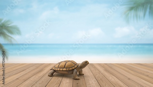 Obraz premium Sea turtle souvenir on wooden surface with pale blue background