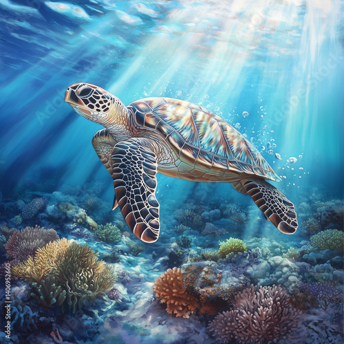© Fabrizio, Obraz premium Sea turtle splashes on the seabed with corals