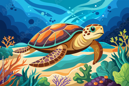 Naklejka premium Sea turtle splashes on the seabed with corals wallpaper