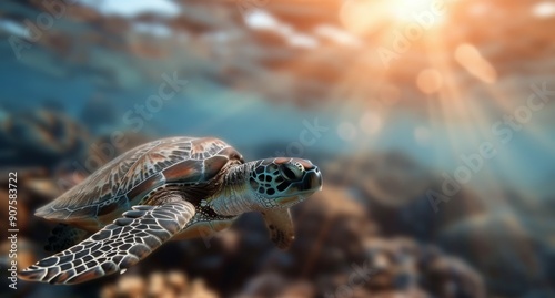 Obraz premium Sea Turtle Swimming Above Coral Reef at Sunset