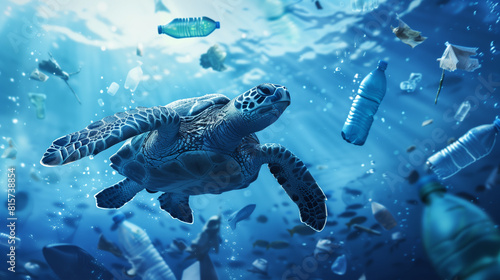 Fototapeta premium Sea Turtle Swimming Amongst Plastic Pollution