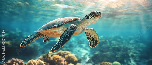 Fototapeta premium Sea turtle swimming gracefully in clear blue ocean water with sunlight...