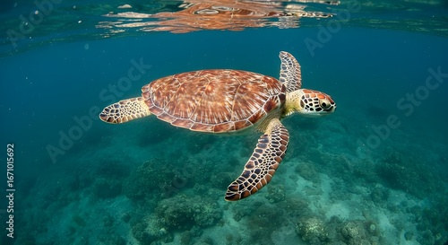 Obraz premium Sea turtle swimming gracefully underwater in clear ocean