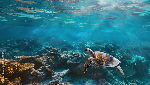© diwek, Obraz premium Sea Turtle Swimming in a Vibrant Coral Reef