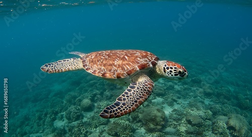 © Fenti, Obraz premium Sea turtle swimming in clear blue ocean water.