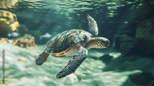 © Theo, Fototapeta premium Sea Turtle Swimming in Pristine Turquoise Waters