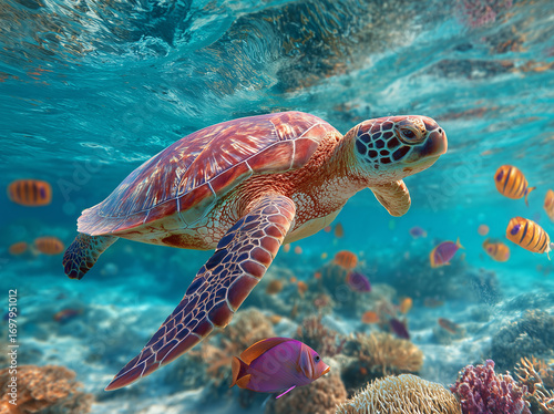 Fototapeta premium Sea turtle swimming in the ocean with fish