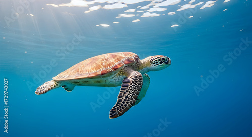 © Sugiri80, Obraz premium Sea Turtle Swimming in Turquoise Ocean Water with Sun Rays