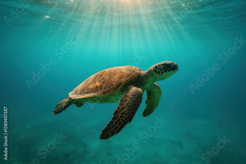 Obraz premium Sea turtle swimming in turquoise water with sunbeams