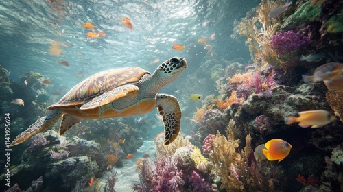 Naklejka premium Sea turtle swimming in vibrant coral reef with colorful fish.