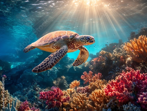 Obraz premium Sea turtle swimming over colorful coral reef