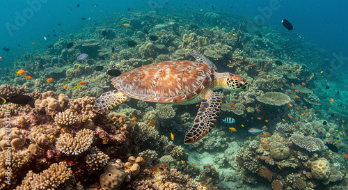 Fototapeta premium Sea Turtle Swimming Over Coral Reef Underwater Habitat