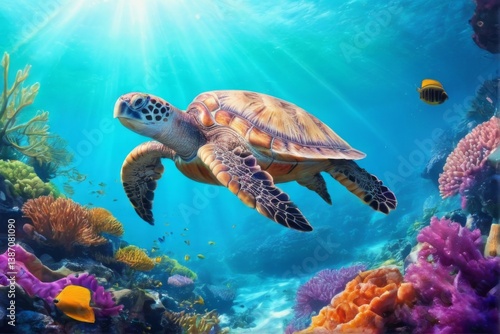 Obraz premium Sea Turtle Swimming Through Colorful Coral Reef Underwater