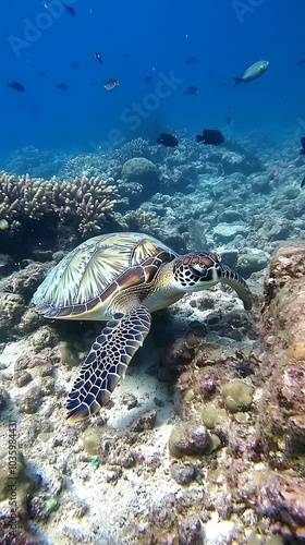 Naklejka premium Sea Turtle Swimming Through Coral Reef in the Ocean