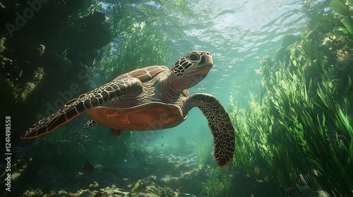 Fototapeta premium Sea Turtle Swimming Through Lush Underwater Vegetation