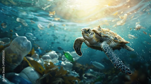Obraz premium Sea Turtle Swimming Through Plastic Pollution