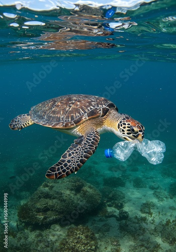 Obraz premium Sea Turtle Swimming Underwater Carrying Plastic Bottle in Ocean