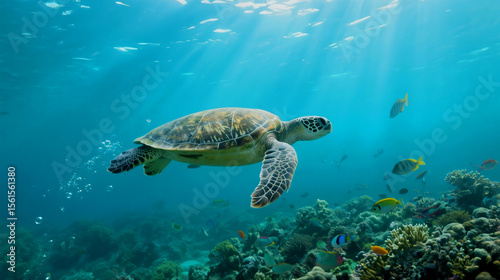 © Abdullah, Obraz premium Sea turtle swims gracefully among vibrant corals, bathed in ocean sunlight