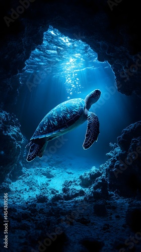 © doaibu, Obraz premium Sea turtle swims in an underwater cave