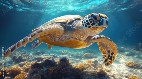 © Ali, Fototapeta premium Sea turtle swims over vibrant coral reef.