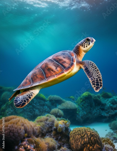 © Stefan, Fototapeta premium Sea turtle swims under water on the background of coral reefs