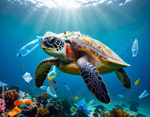 © Lutfiyatul, Fototapeta premium Sea turtle trapped in ocean plastic waste, swimming above coral reef. A strong message for marine conservation and plastic pollution awareness,international plastic bag free day